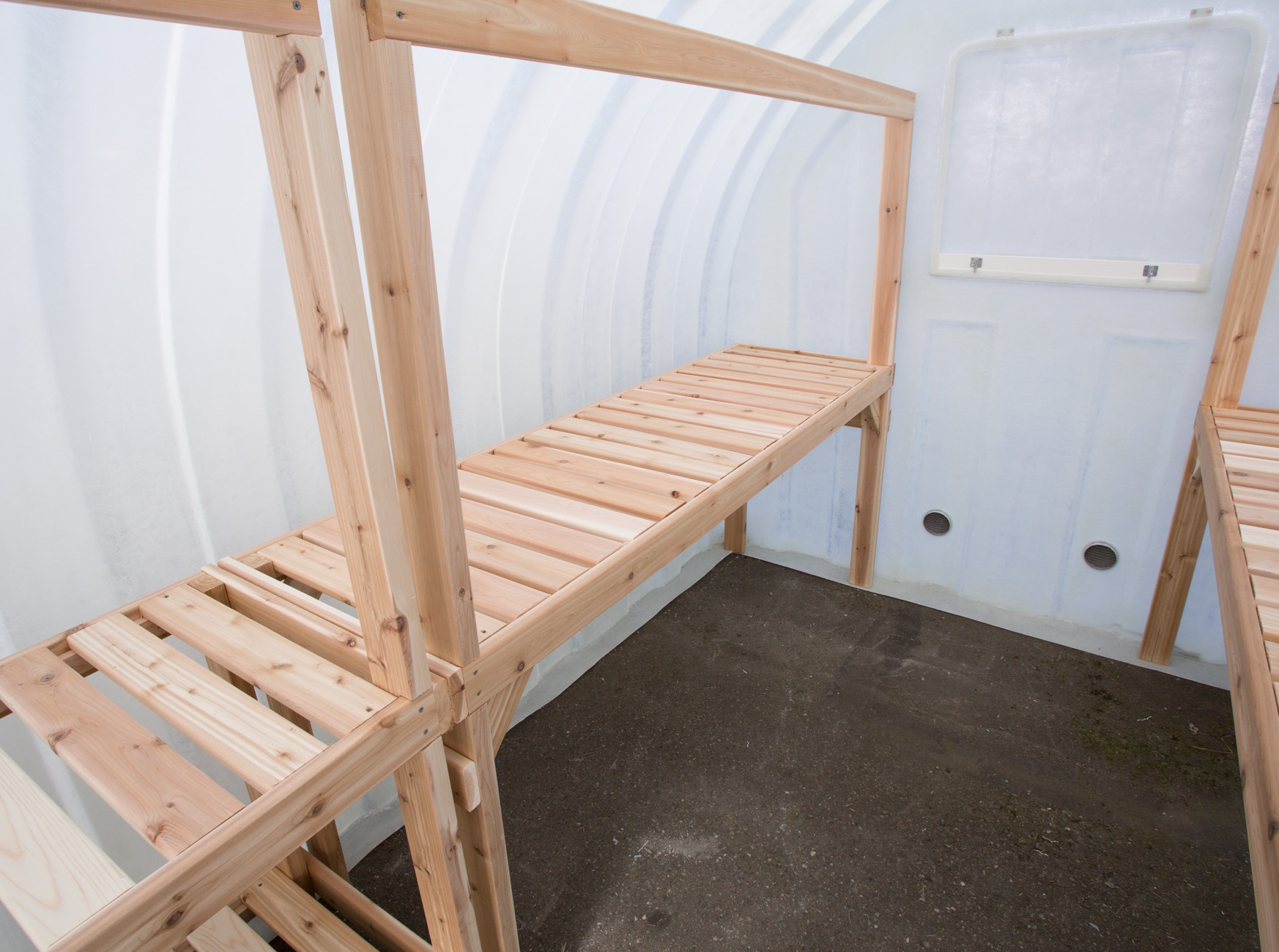 Our 100% Cedar work tables are precision designed in our factory, and they come to you pre-built…you have nothing to assemble! Each comes with one hang rail and removable slats which allows for great space flexibility and the accommodating of tall plants. You can let your tomato plant grow right up through the table, up to the ceiling, and still use the rest of it for potted plants, trays, and starts. With only a top shelf, the Single Work Table is ideal for growing directly into the soil below it, create a small raised bed, or use the lower area for storage and supplies. Our extra large potting tray and watering tray fit right into the table by removing some of the slats. Cedar work tables that fit our Medium greenhouses are each 6 feet in length, and those designed for our Large greenhouses are 7.5 feet each in length. A maximum of four cedar work tables can fit into our Medium and Large greenhouses, where our Small can accommodate just two.